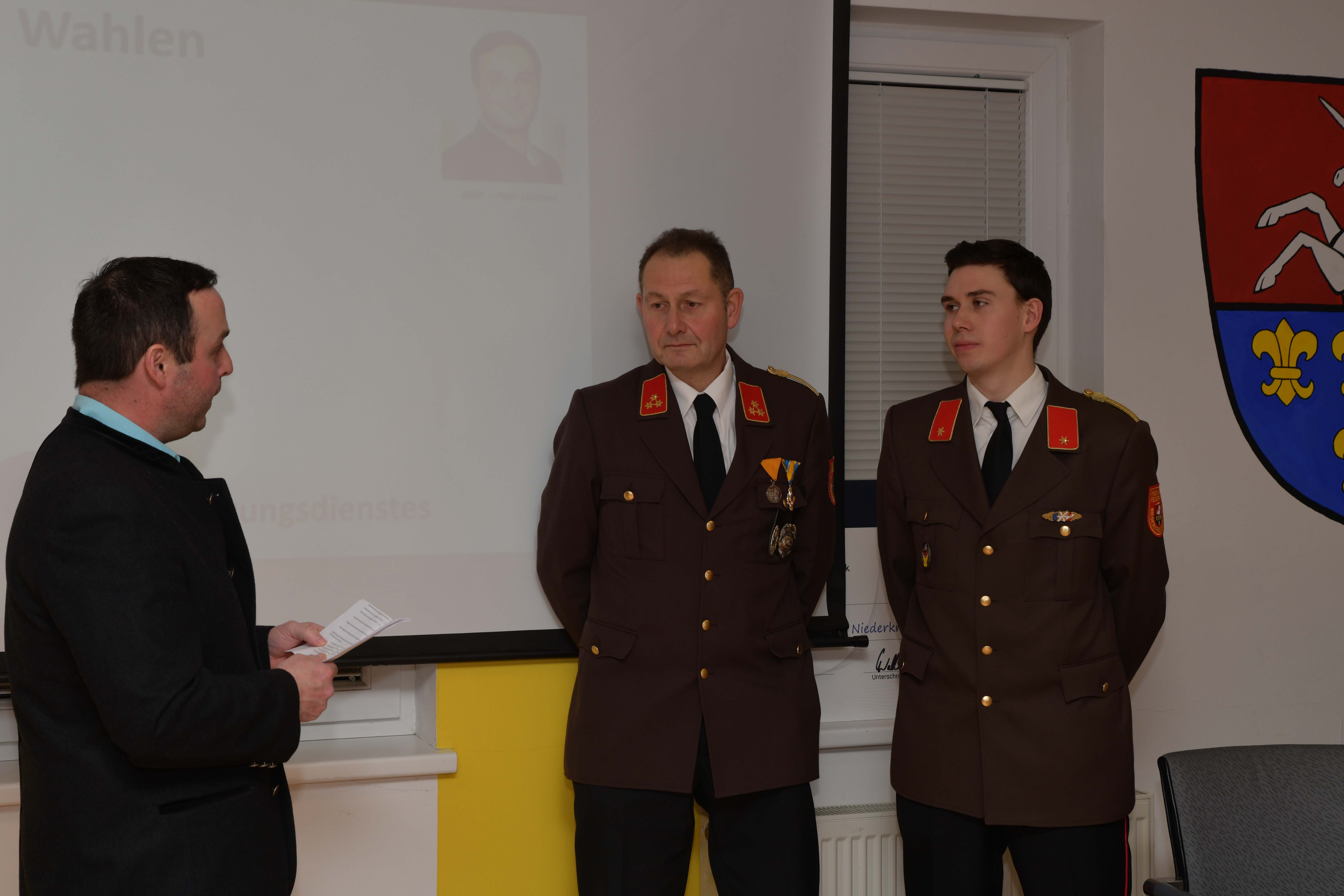 Der Bürgermeister übernahm anschließend das Wort, bedankte sich beim Kommando für die abgelaufene Periode und fungierte als Wahlleiter bei der Wahl des neuen Kommandos. Nach Auszählung der Stimmen wurden BHI Thomas Toifl als Feuerwehrkommandant und BI Felix Wannenmacher als 1. Feuerwehrkommandant-Stellvertreter durch den Bürgermeister Peter Ullmann angelobt.