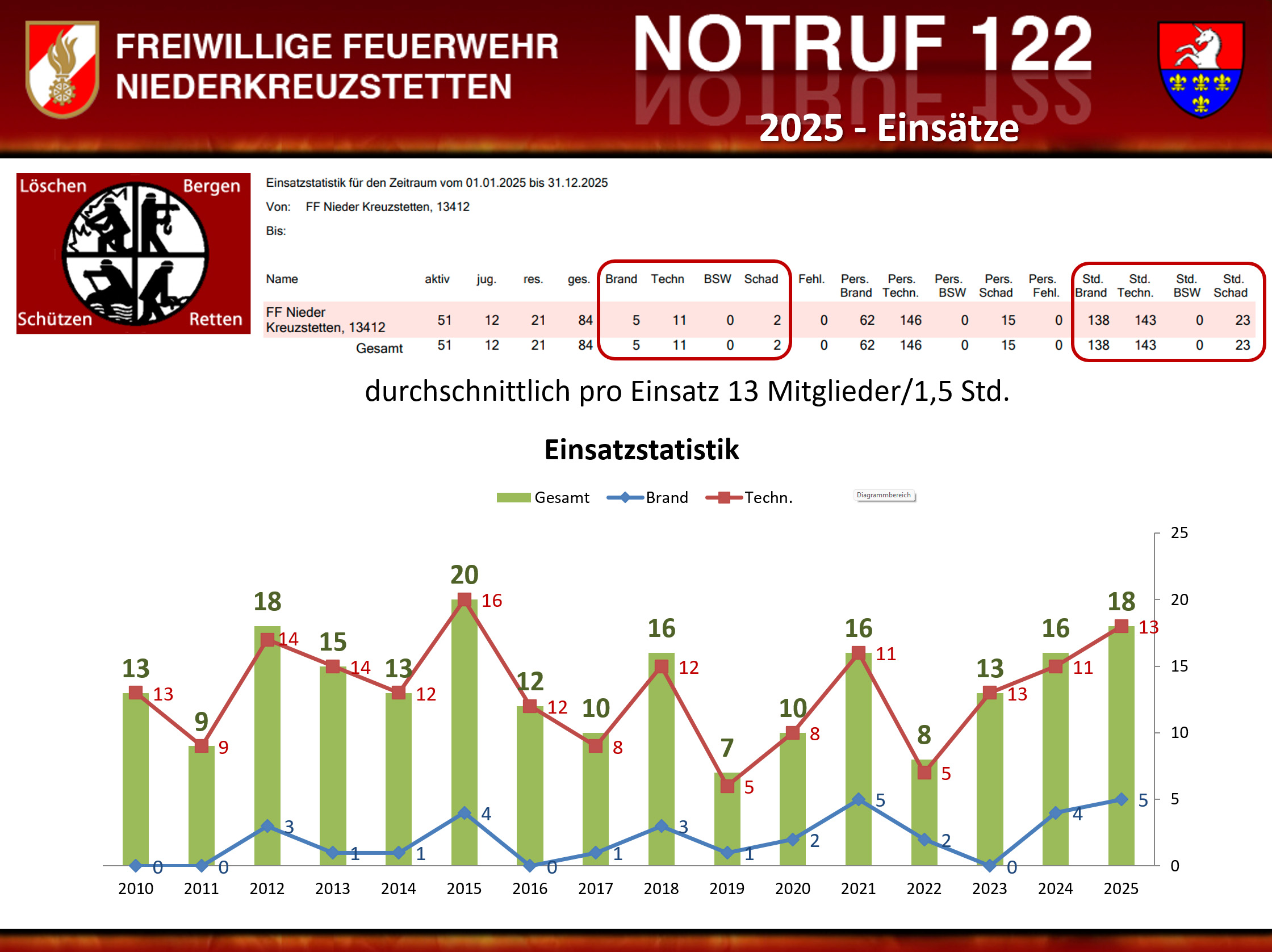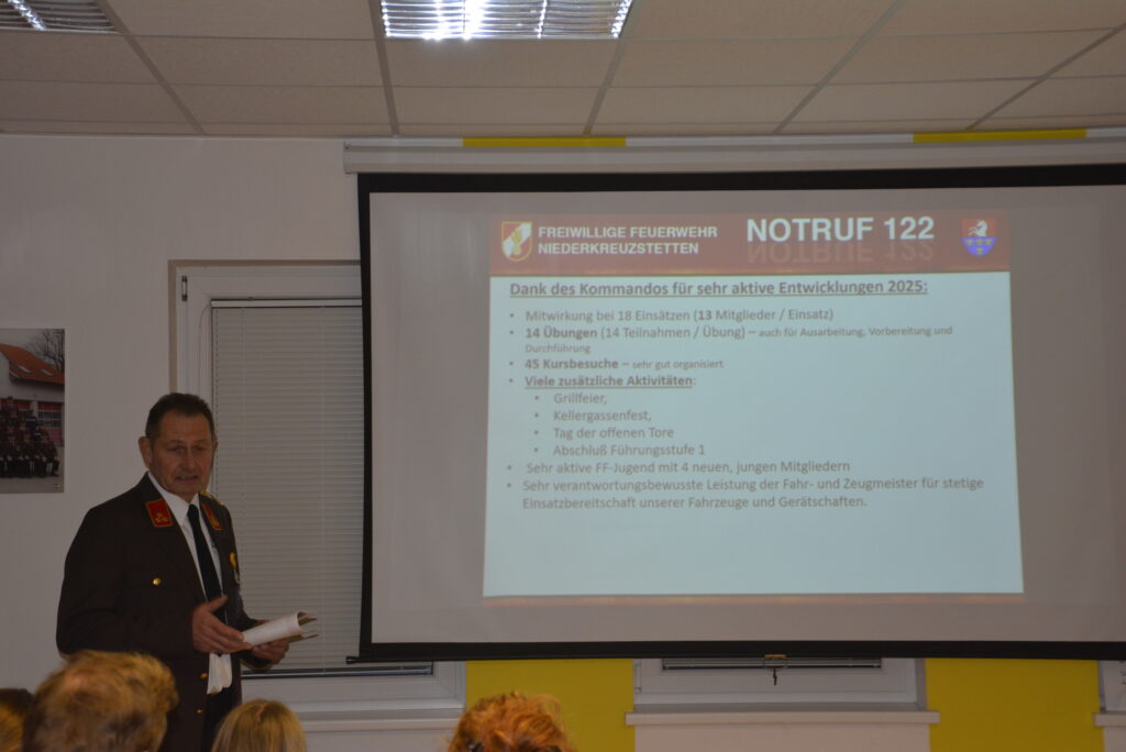 Im Anschluss folgte der Bericht 2025, welcher letztmalig von OV Alois Schneider vorgetragen wurde. Im Jahr 2025 hatten wir insgesamt 18 Einsätze zu bewältigen. Um bestmöglich auf Einsätze vorbereitet zu sein, wurden zahlreiche spannende Übungen abgehalten.