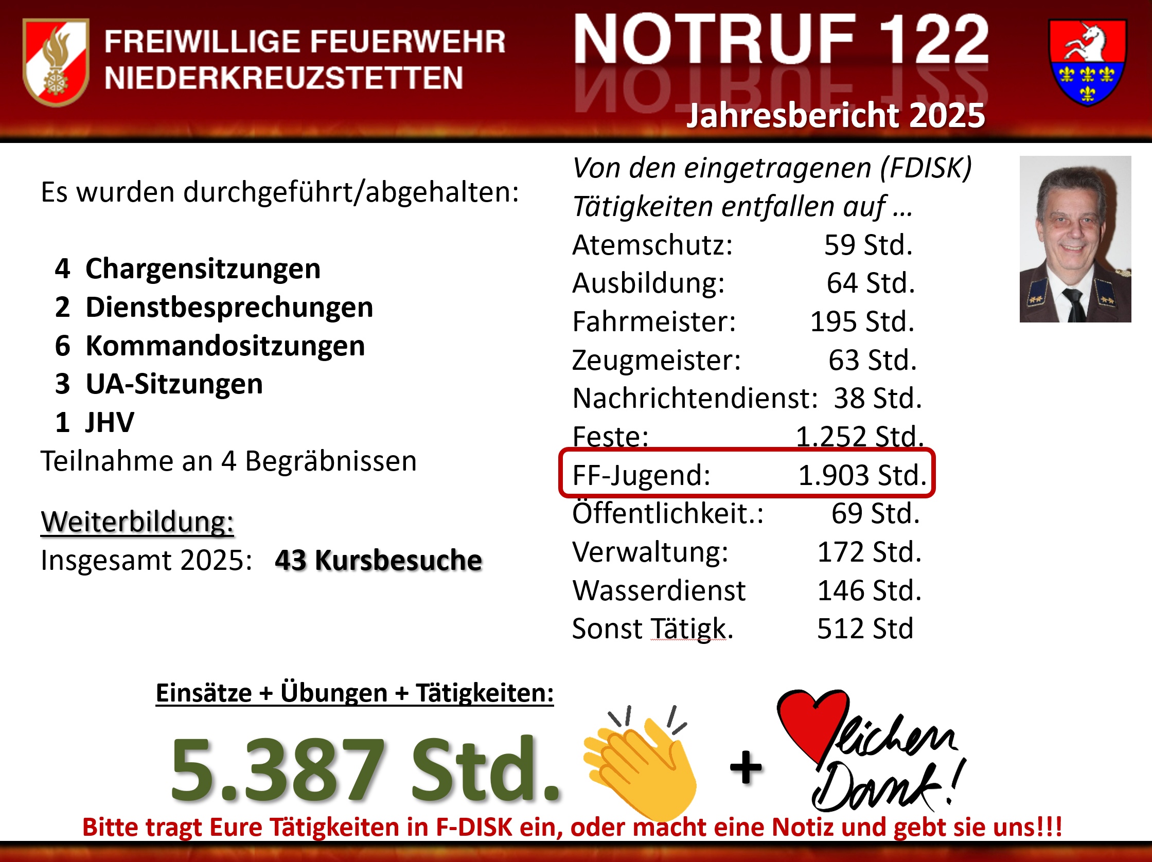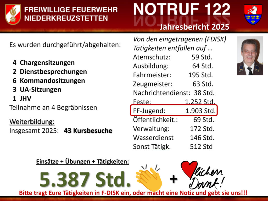 Insgesamt wurden für das Feuerwehrwesen rund 5.400 Stunden für Einsätze, Übungen, Veranstaltungen und Kurse aufgewendet. An dieser Stelle ein riesiges Dankeschön an alle Kameraden, denn nur im Kollektiv können diese Leistungen erbracht werden.