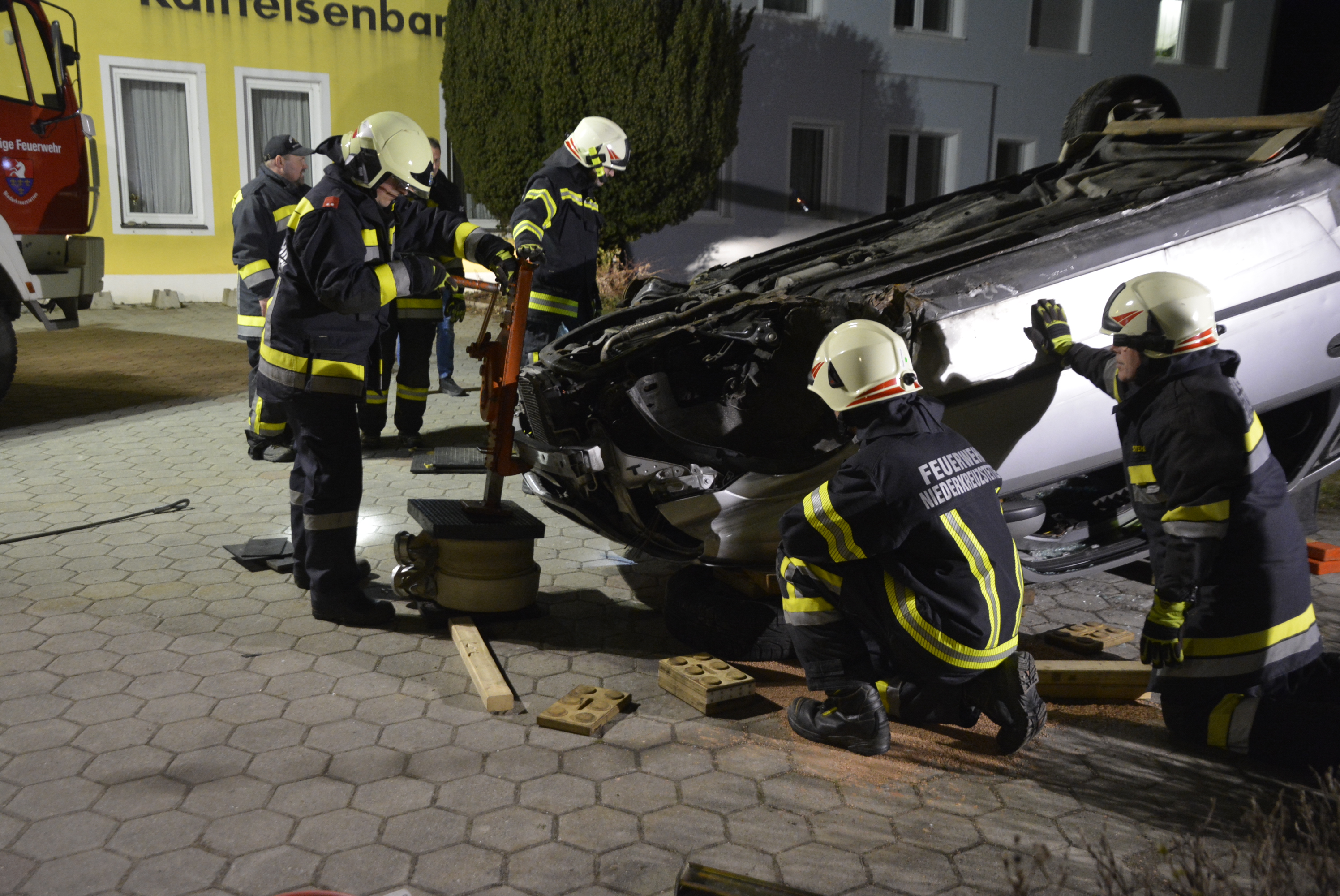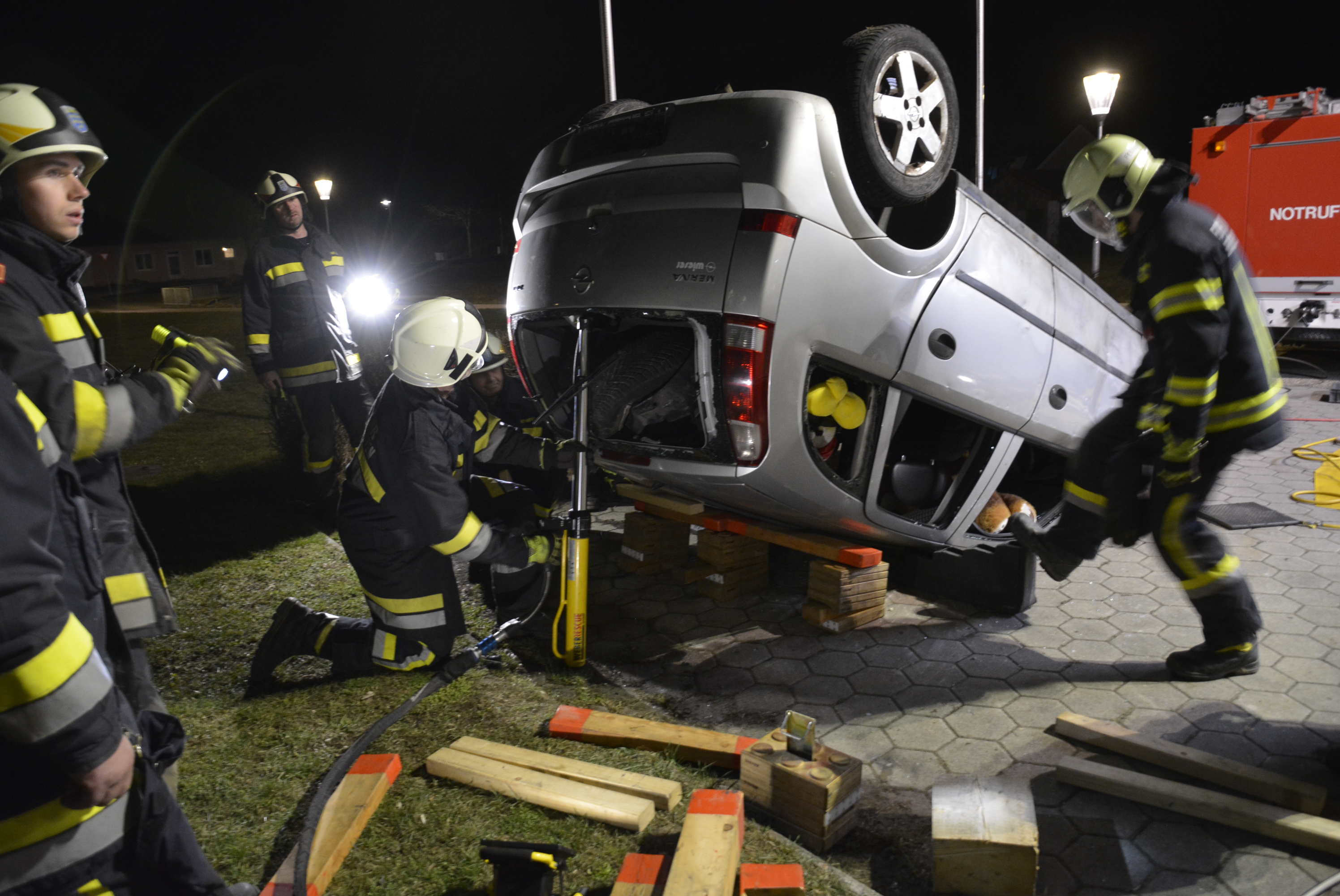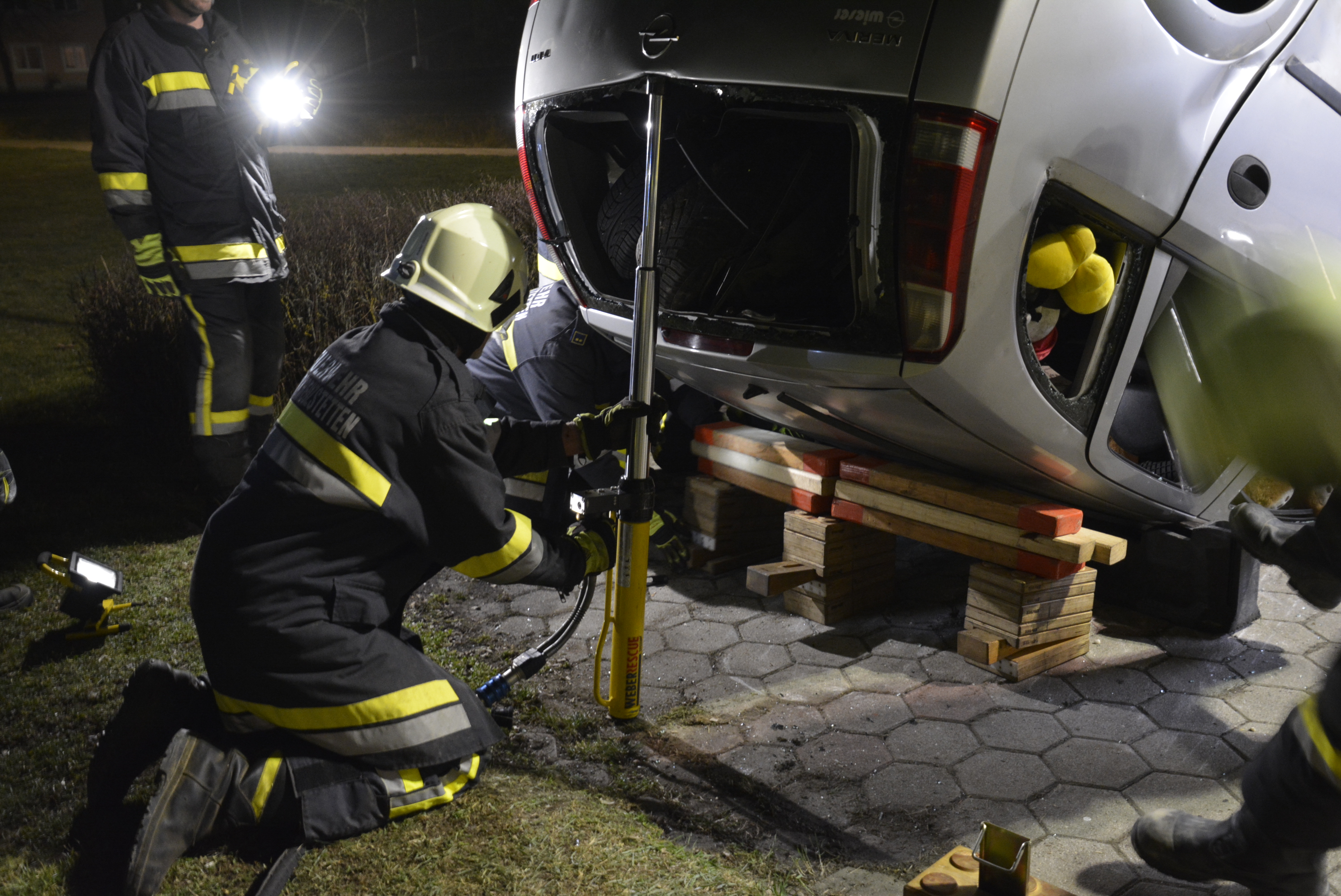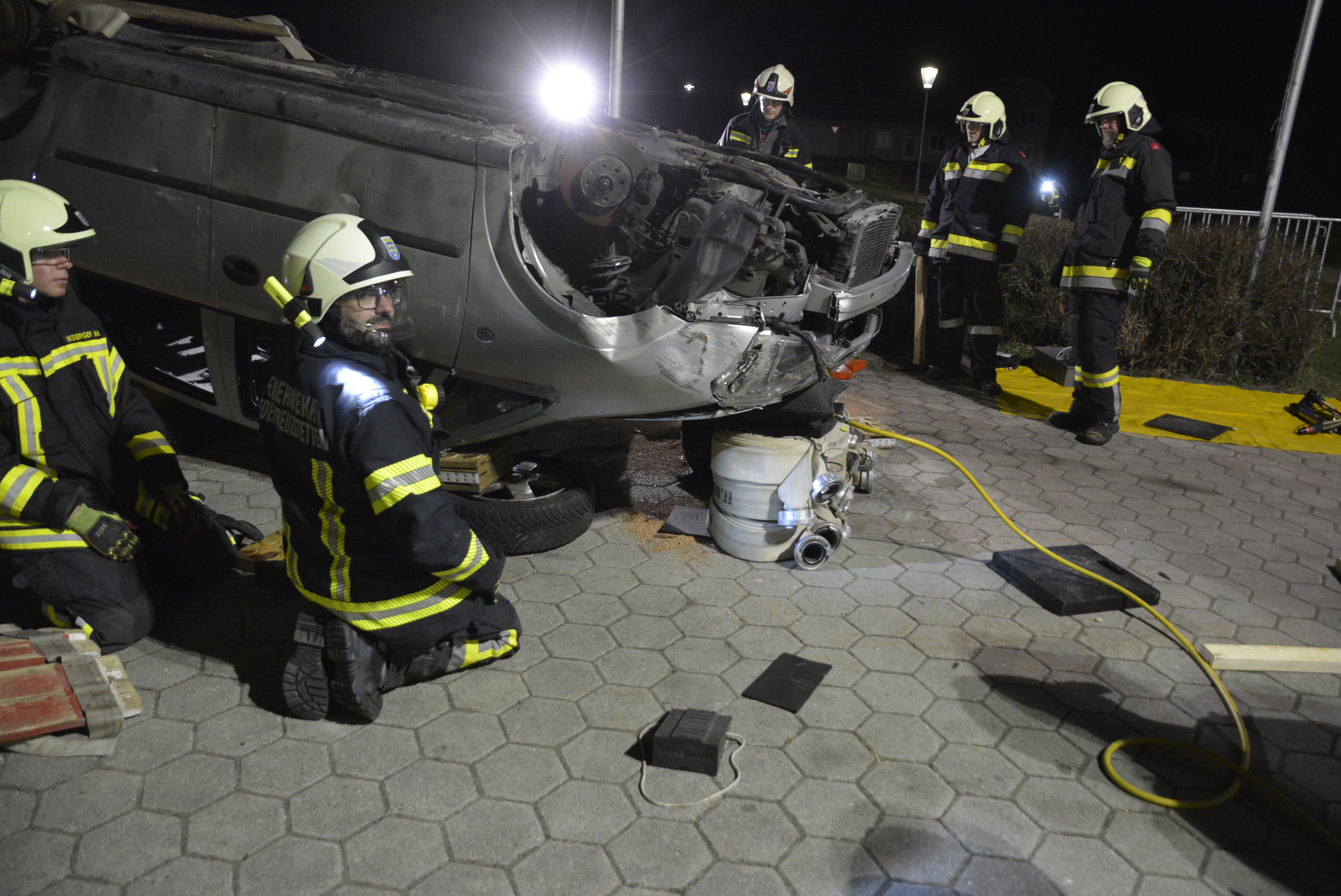 Im Anschluss an den theoretischen Teil ging es um das praktische Sammeln von Erfahrungen im Umgang mit den einzelnen Geräten. Dafür stand beim Feuerwehrhaus Oberkreuzstetten ein PKW zur Verfügung, der auf dem Dach lag. Als Übungsziel wurde vorgegeben, dass alle zuvor besprochenen Hebewerkzeuge beim Anheben des Fahrzeugs zum Einsatz kommen müssen. Zudem sollte das Auto so weit angehoben werden, dass eine Bierkiste unter dem Fahrzeug hindurchgeschoben werden kann.