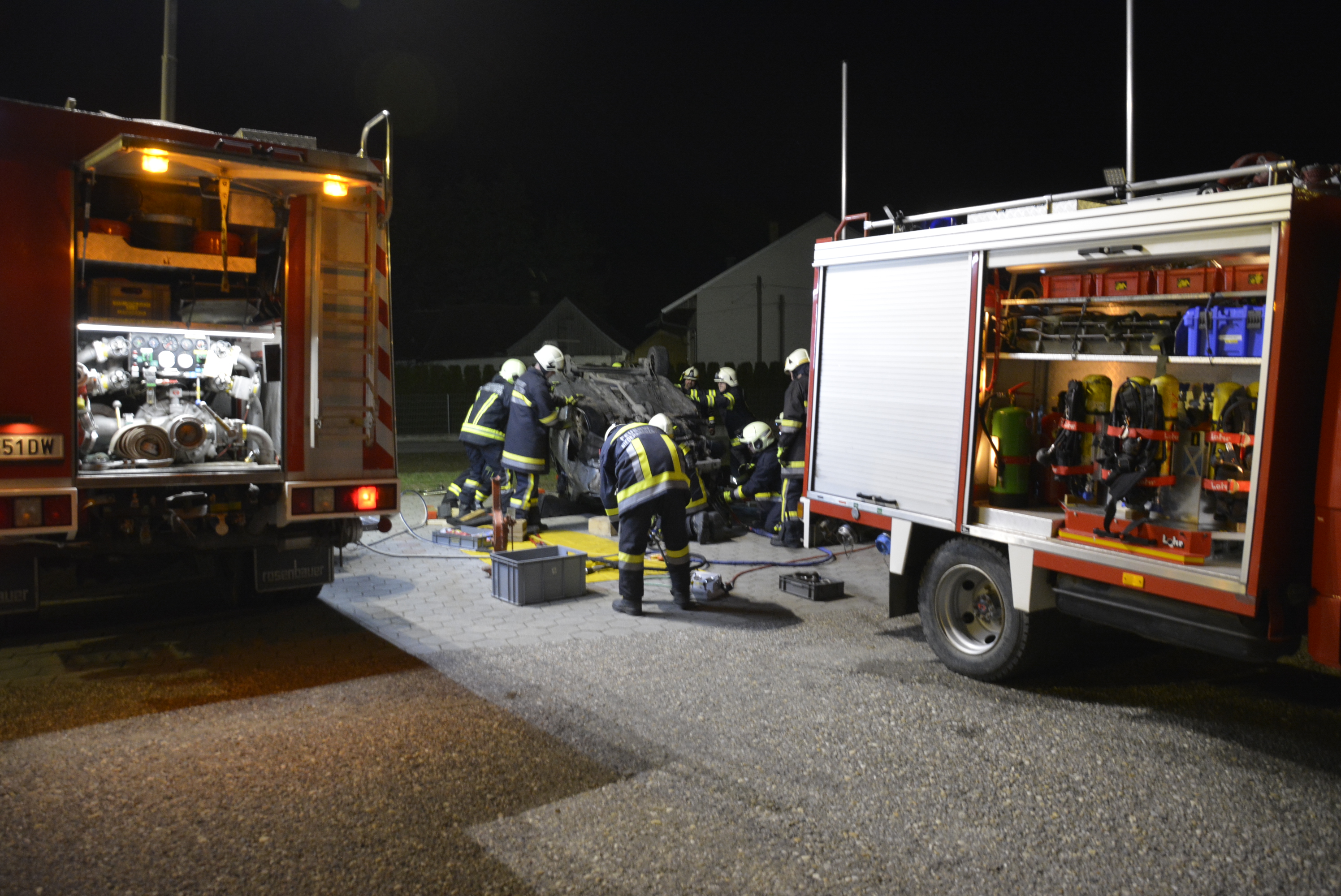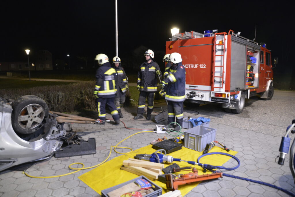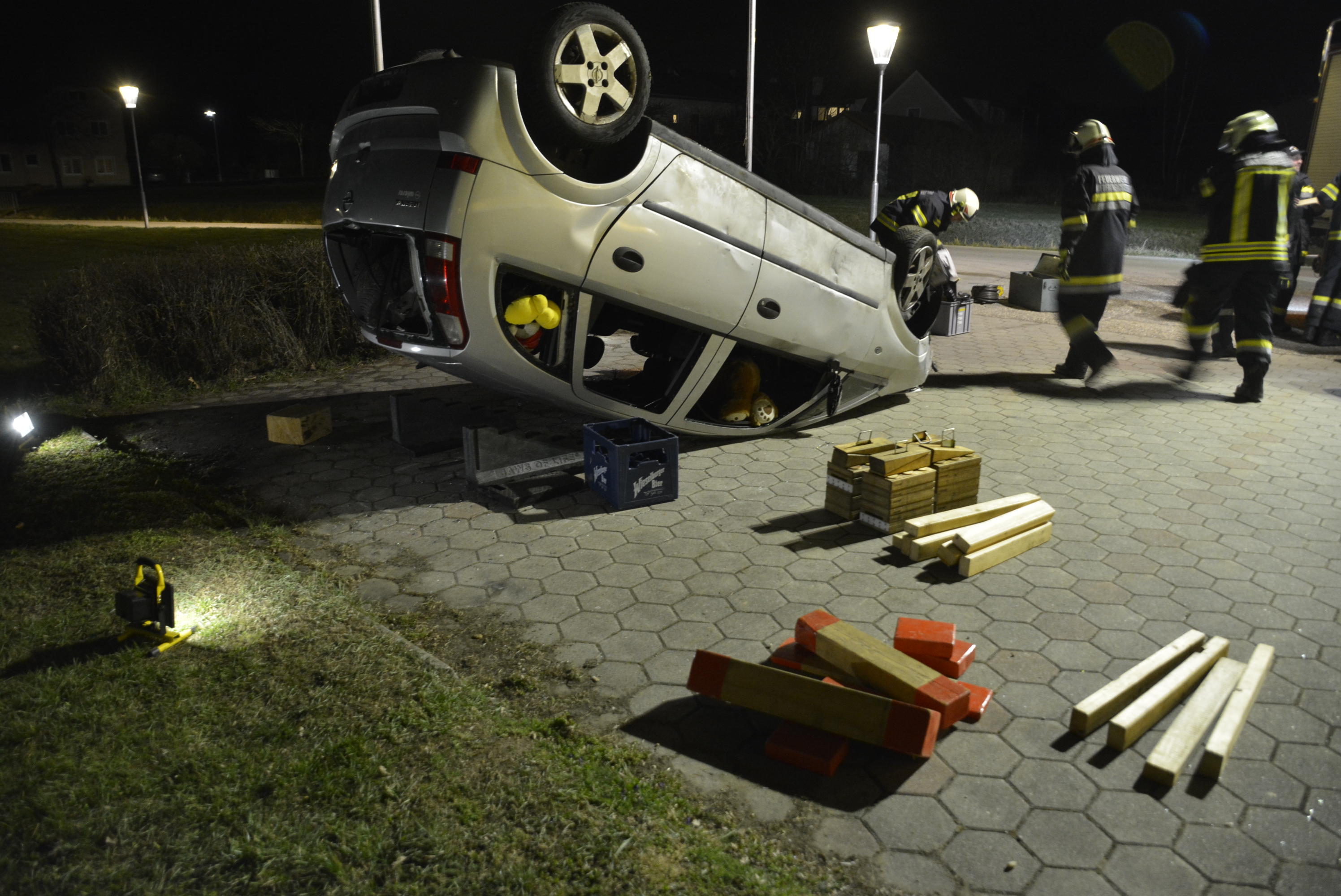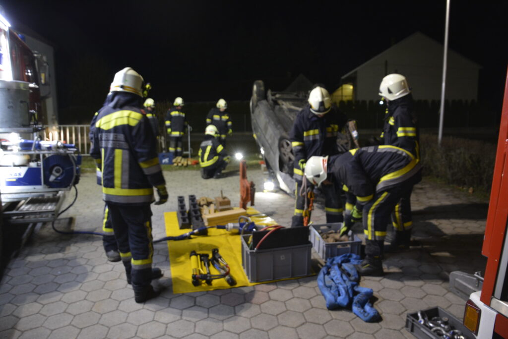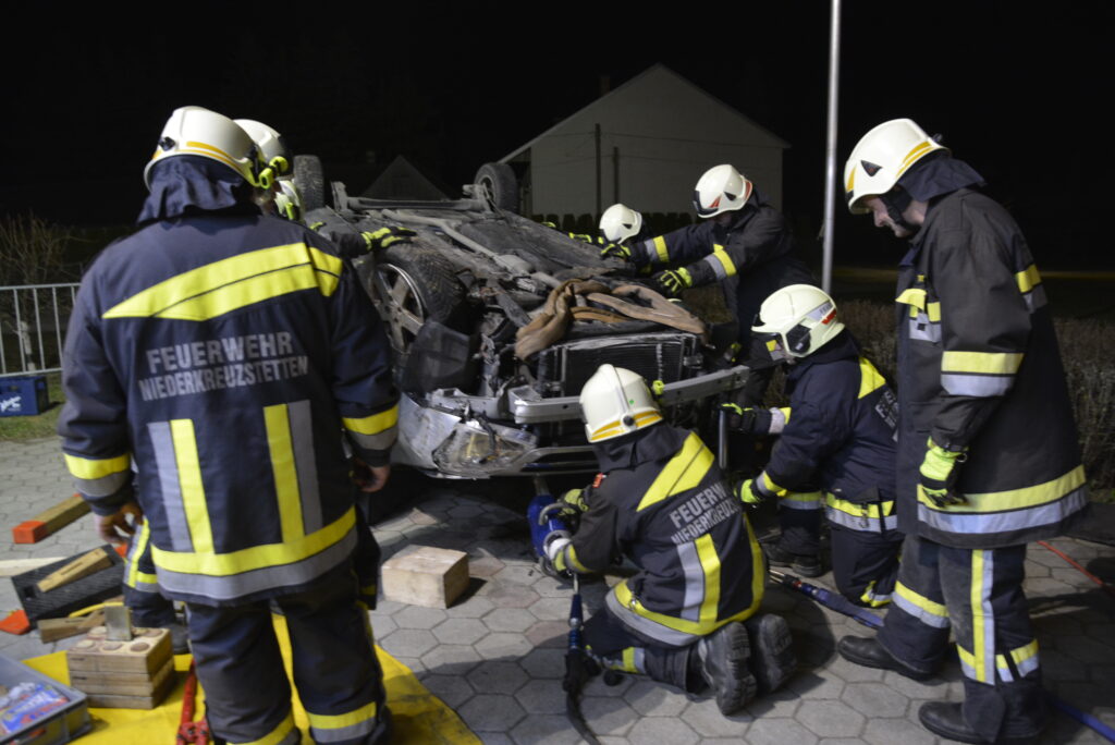 Im Anschluss an den theoretischen Teil ging es um das praktische Sammeln von Erfahrungen im Umgang mit den einzelnen Geräten. Dafür stand beim Feuerwehrhaus Oberkreuzstetten ein PKW zur Verfügung, der auf dem Dach lag. Als Übungsziel wurde vorgegeben, dass alle zuvor besprochenen Hebewerkzeuge beim Anheben des Fahrzeugs zum Einsatz kommen müssen. Zudem sollte das Auto so weit angehoben werden, dass eine Bierkiste unter dem Fahrzeug hindurchgeschoben werden kann.