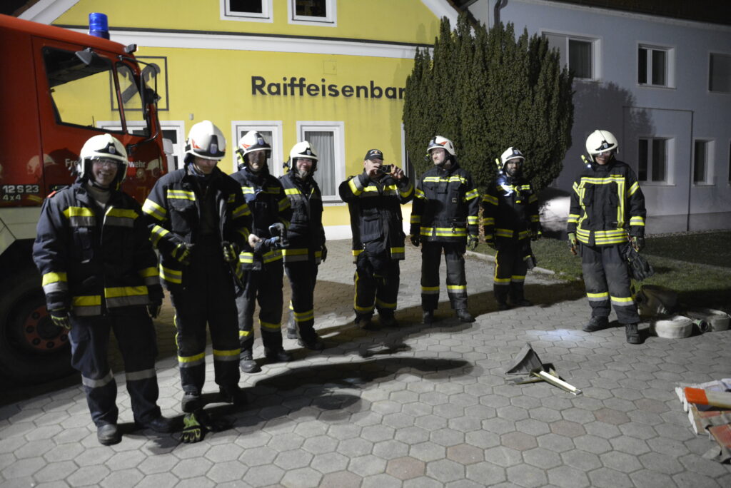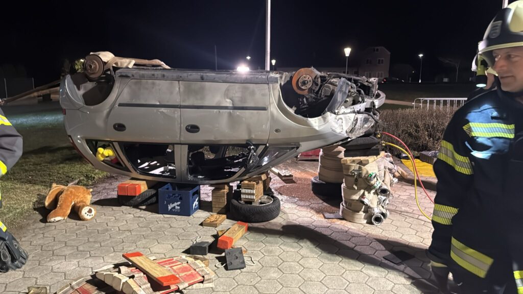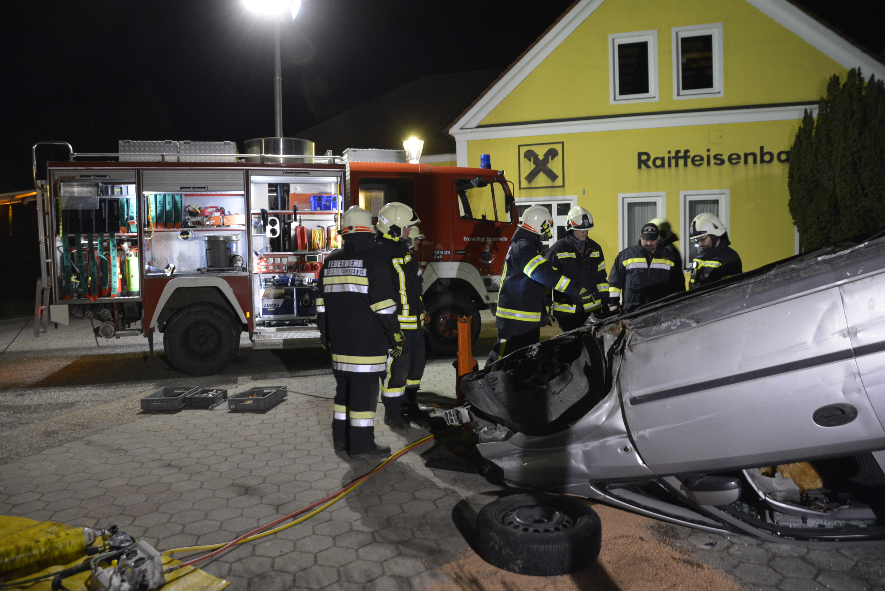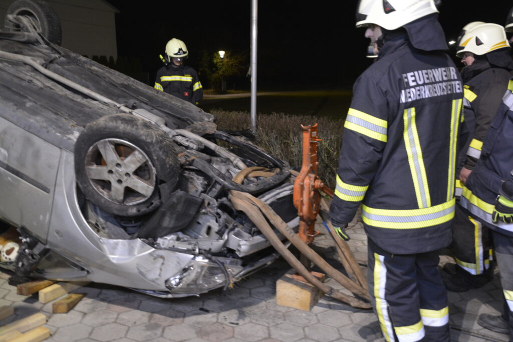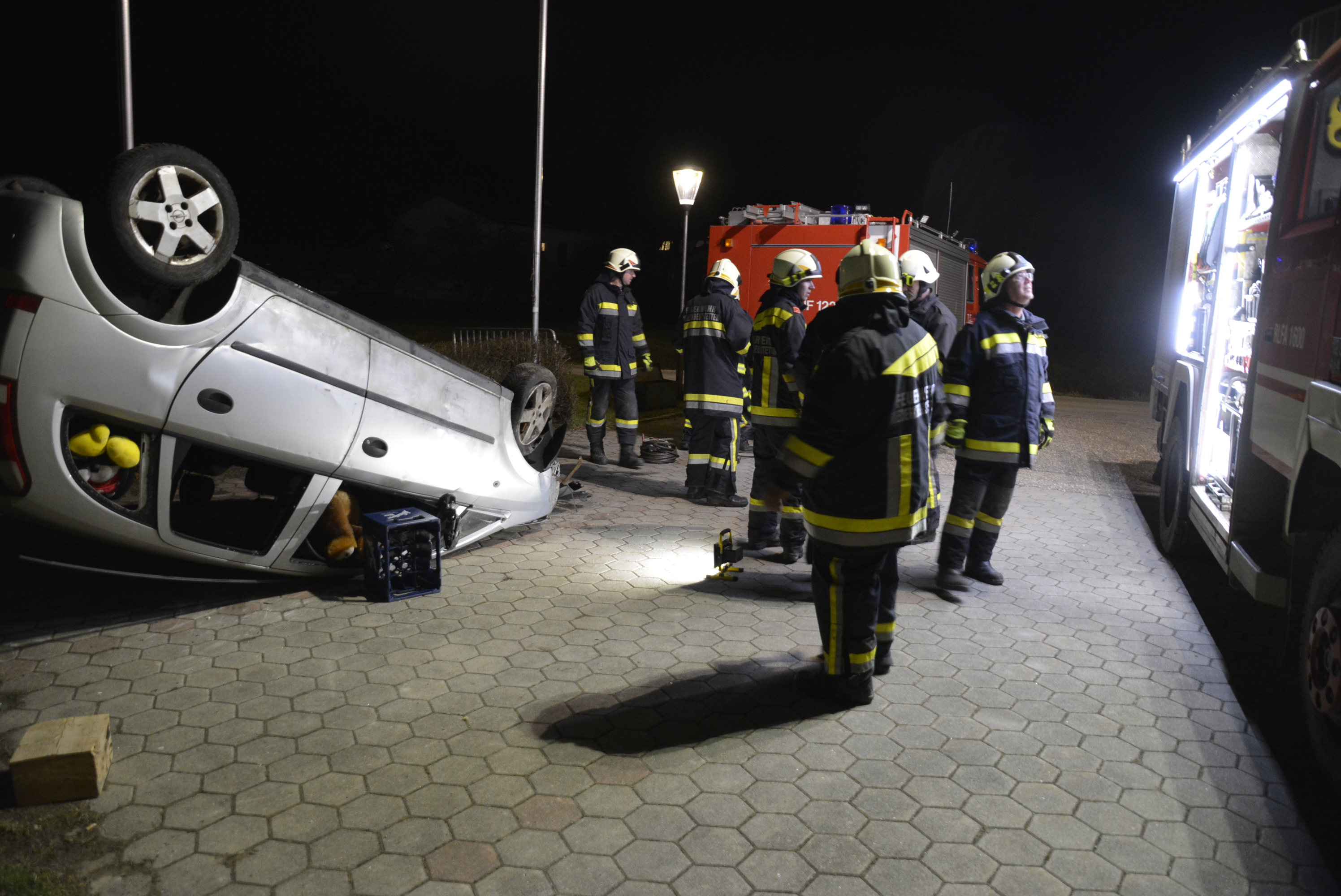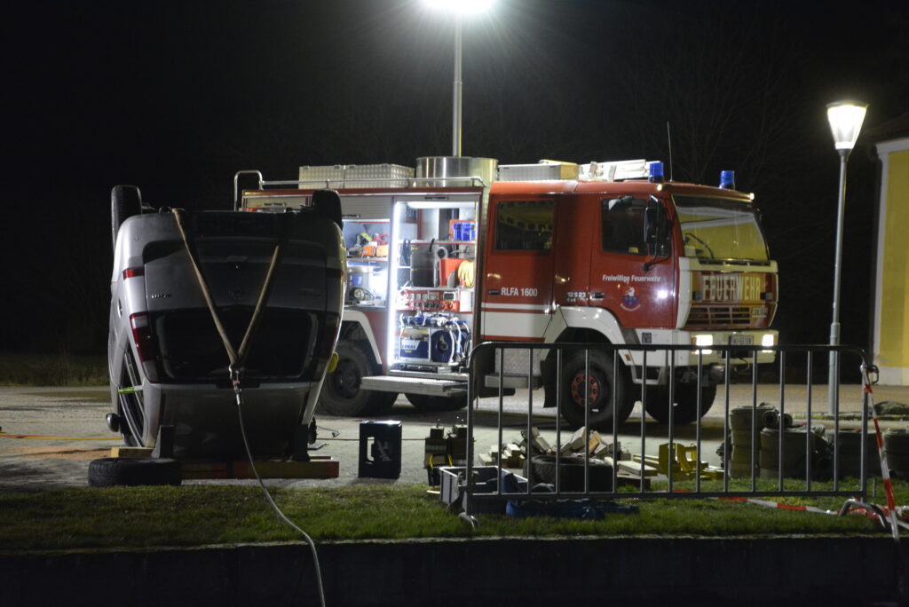 Im Anschluss an den theoretischen Teil ging es um das praktische Sammeln von Erfahrungen im Umgang mit den einzelnen Geräten. Dafür stand beim Feuerwehrhaus Oberkreuzstetten ein PKW zur Verfügung, der auf dem Dach lag. Als Übungsziel wurde vorgegeben, dass alle zuvor besprochenen Hebewerkzeuge beim Anheben des Fahrzeugs zum Einsatz kommen müssen. Zudem sollte das Auto so weit angehoben werden, dass eine Bierkiste unter dem Fahrzeug hindurchgeschoben werden kann.