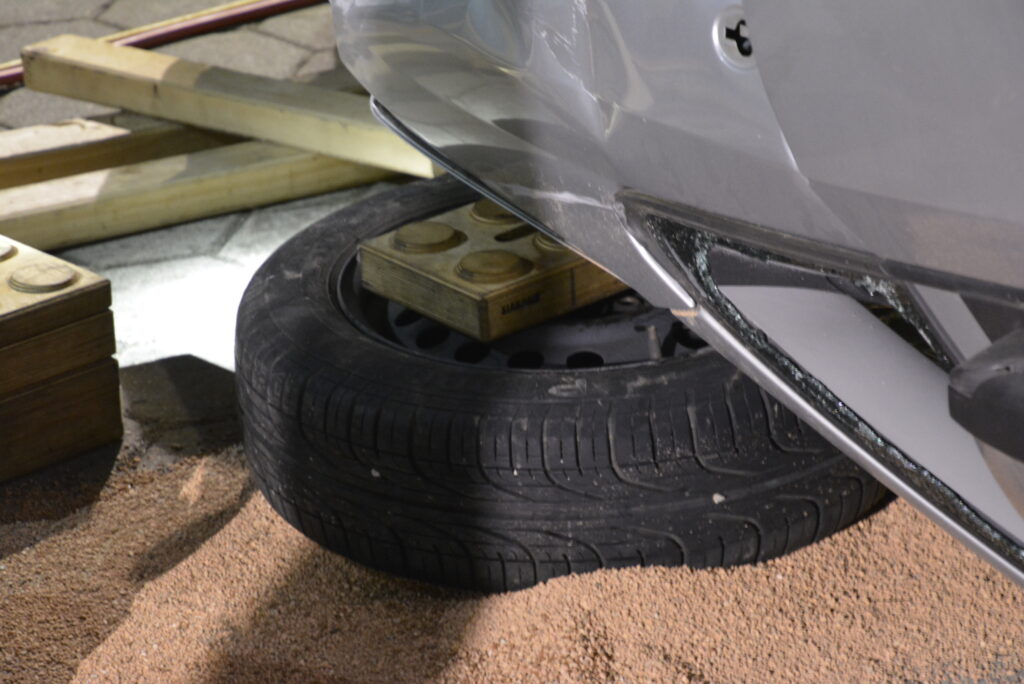 Gruppe 2 löste das Problem des Verrutschens, indem die zuvor demontierten Reifen als Unterbaumaterial eingesetzt wurden. Zusätzlich wurde die Hinterache des Fahrzeuges mit einer Bandschlinge und dem Greifzug stabilisiert. Mit dieser Maßnahme gestaltete sich das Anheben im Bereich der Motorhaube als einfache Aufgabe und das vorgegebene Ziel konnte somit erreicht werden.
