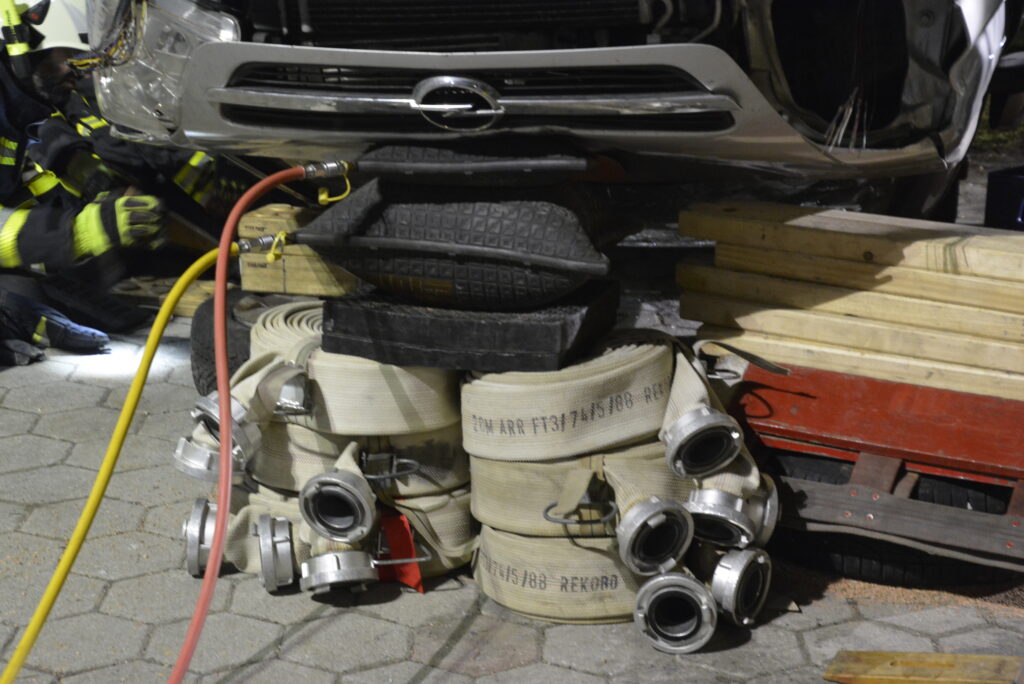 Die anwesenden Kameraden gingen rasch ans Werk, und bereits zu Beginn ergaben sich erste Herausforderungen: Das Fahrzeug verrutschte aufgrund der glatten Lackoberfläche und des verwendeten Unterbaumaterials. Im Verlauf zeigte sich, dass insbesondere mit der Eisenbahnwinde und den Hebekissen ein deutlich stabileres Anheben möglich war.