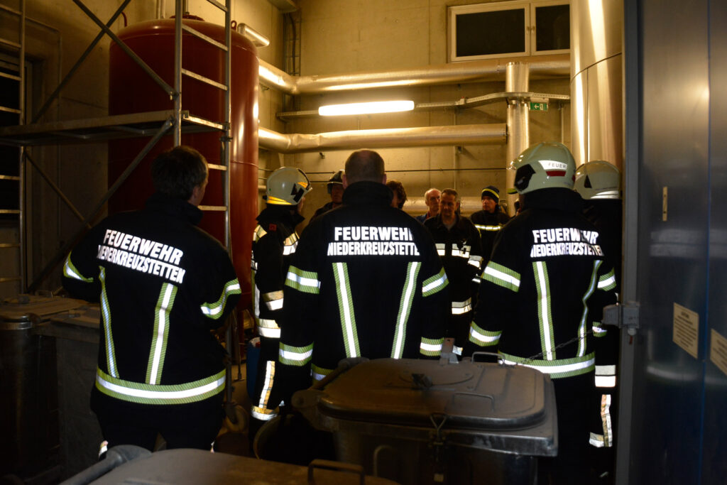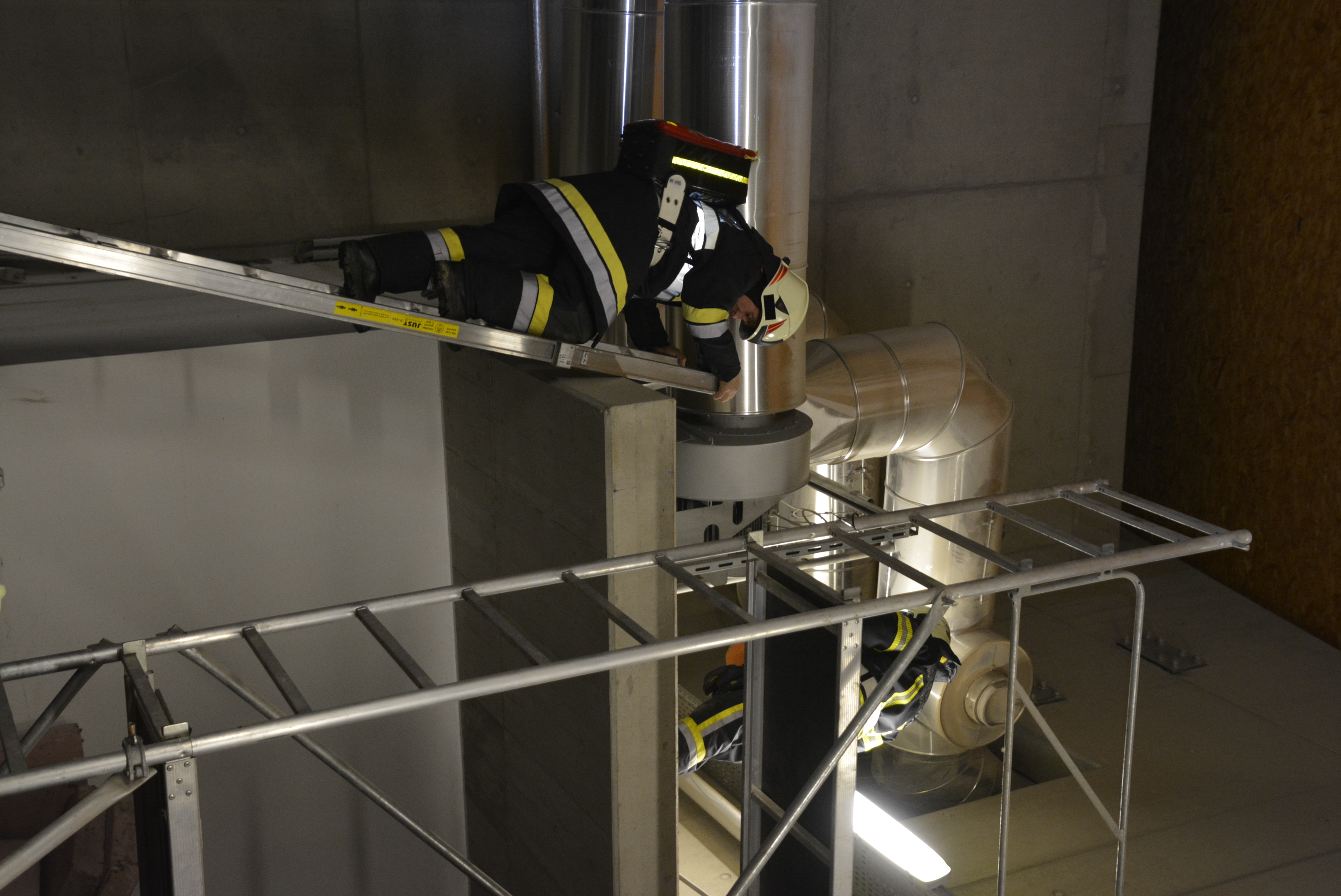 Nach der Theorie ging es in die Praxis: Wir fuhren zum Standort der Nahwärmeanlage, wo ein realistisches Szenario vorbereitet war. Auf einem erhöhten Podest lag ein Dummy, der eine verletzte Person simulierte. Es war unsere Aufgabe diese Person sicher und schonend auf den Boden bringen.