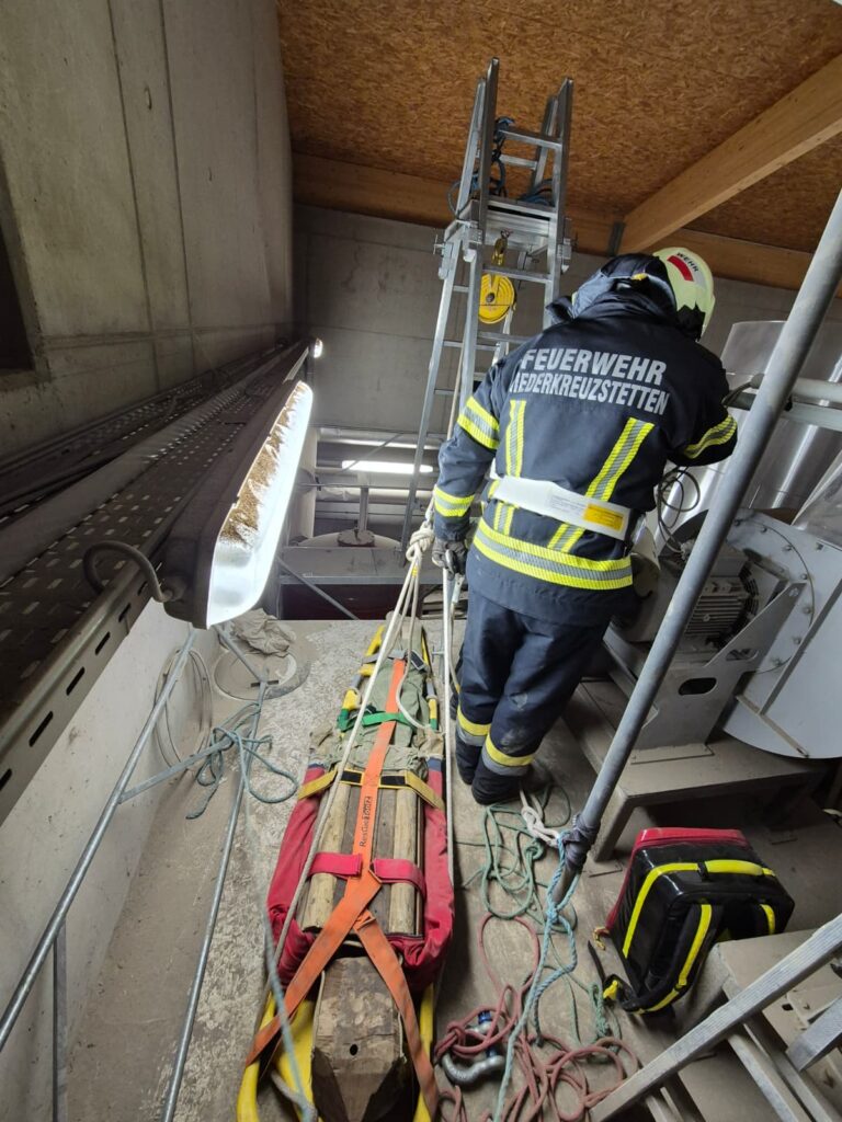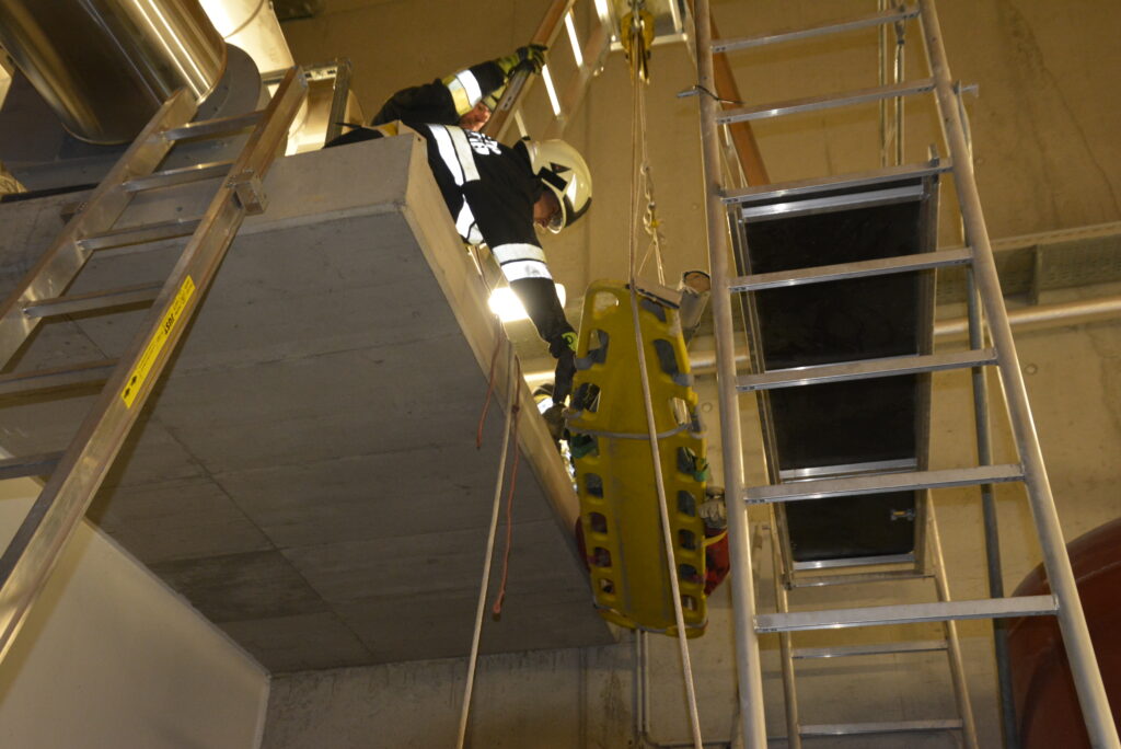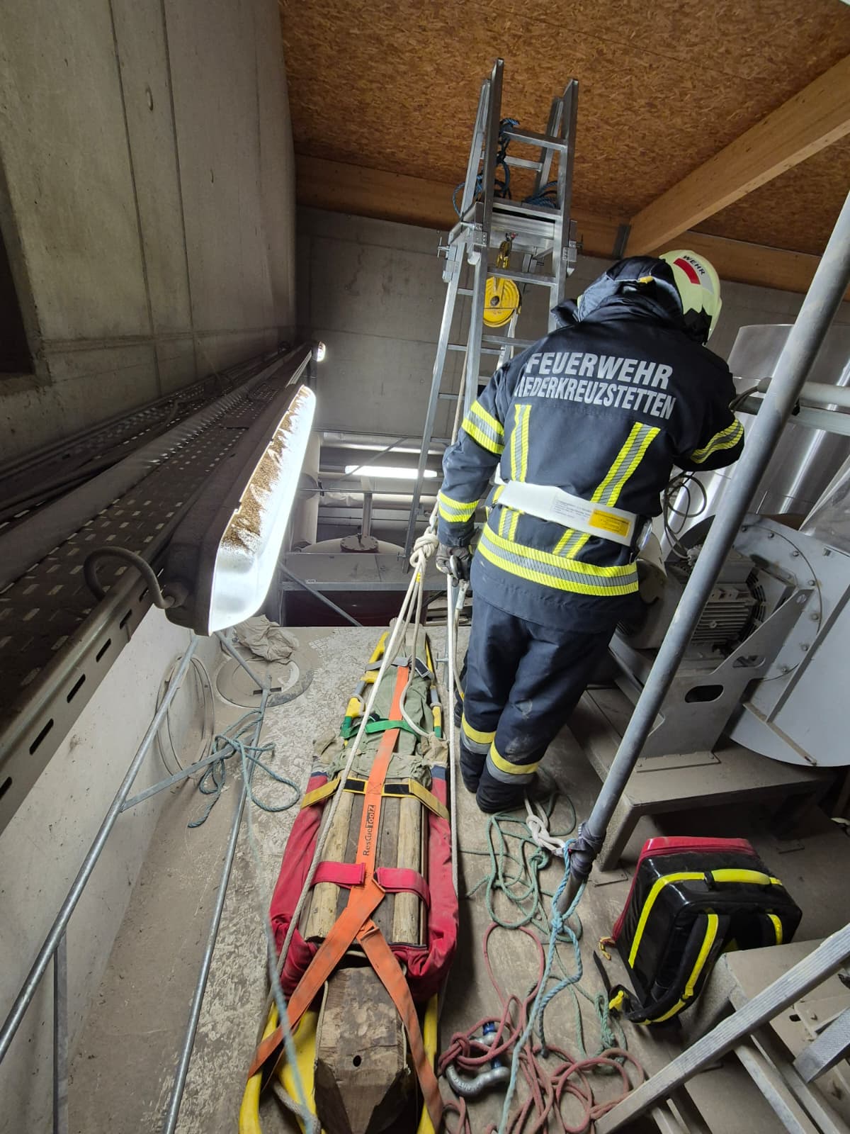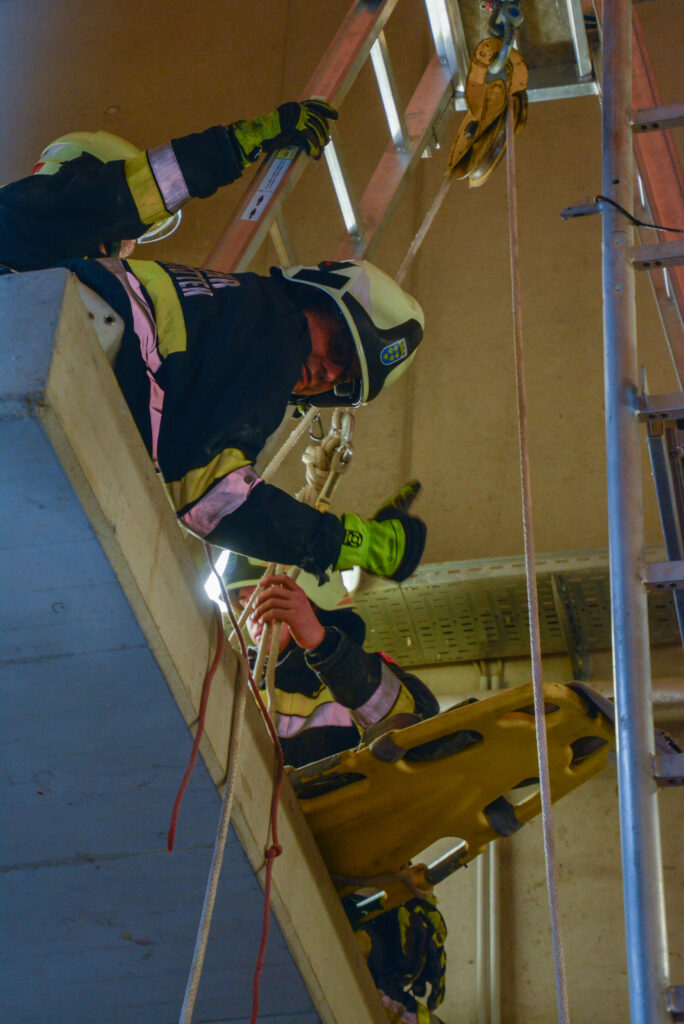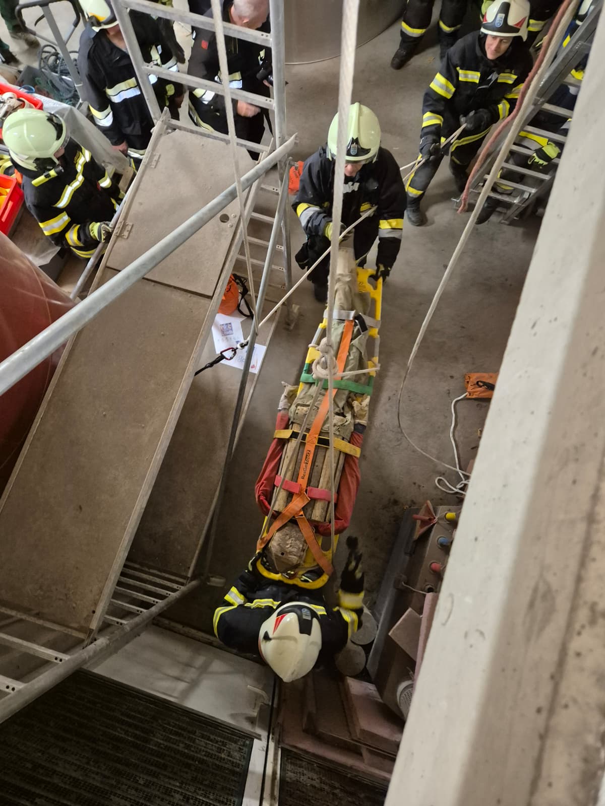Mit präziser Teamarbeit und unter Einsatz von Spinboard, Rettungsleine und Steckleitern wurde die Rettung durchgeführt. Jeder Handgriff musste sitzen – Kommunikation, Sicherung und Technik waren entscheidend. Nach kurzer Zeit war der „Patient“ sicher am Boden, und die Übung konnte erfolgreich abgeschlossen werden.