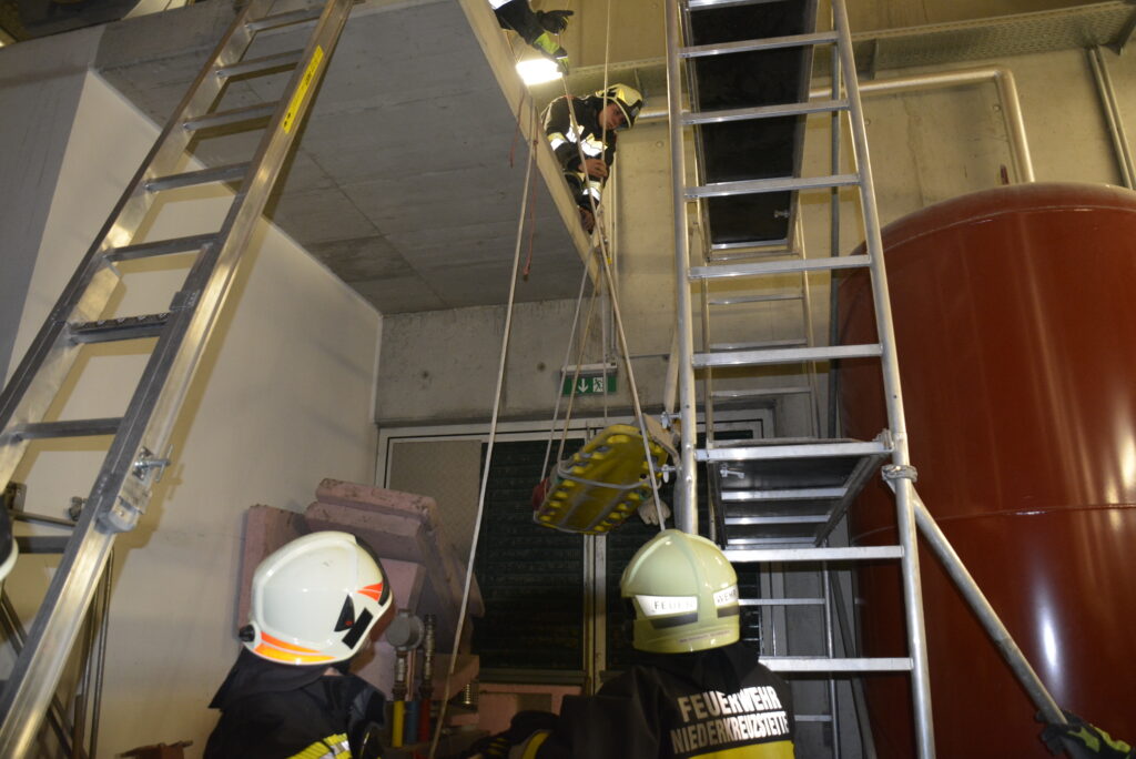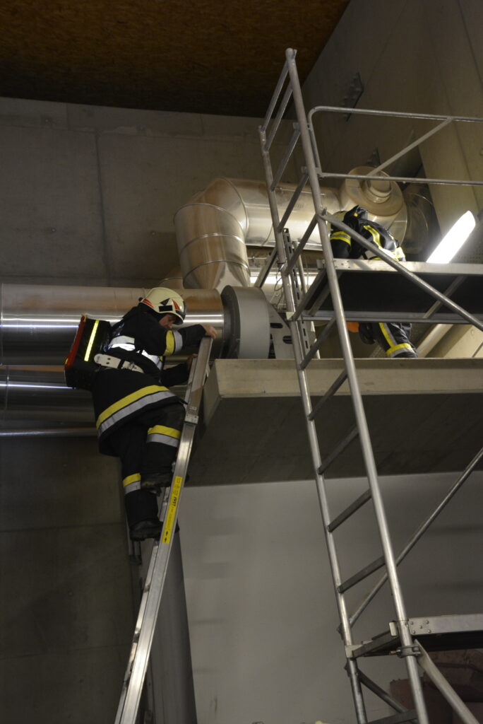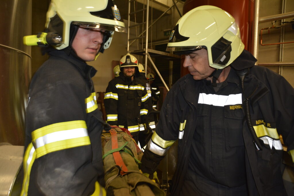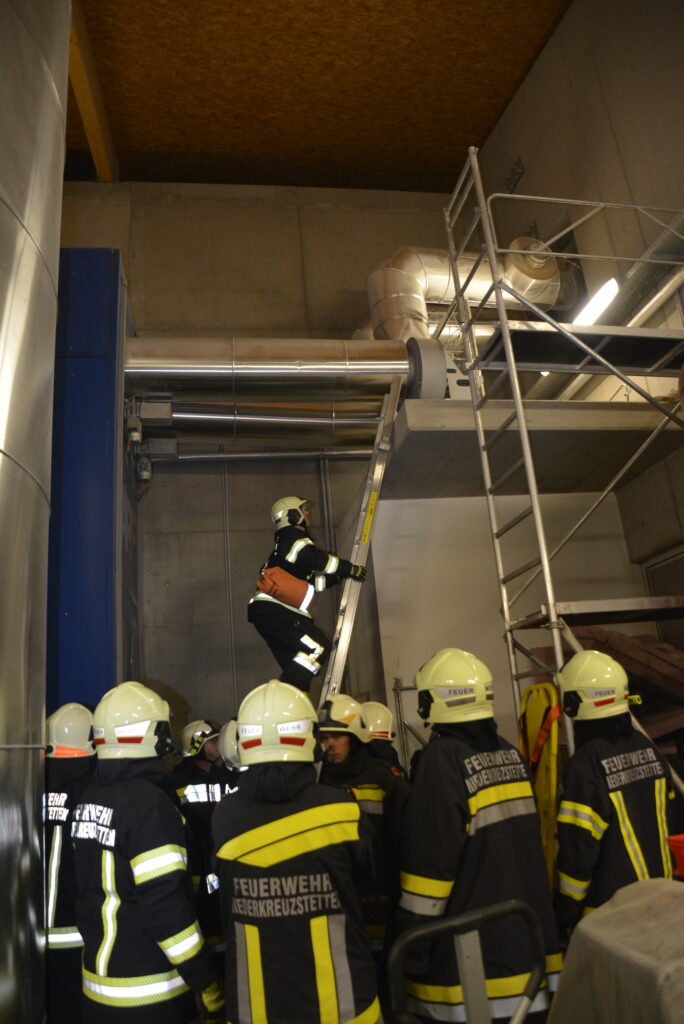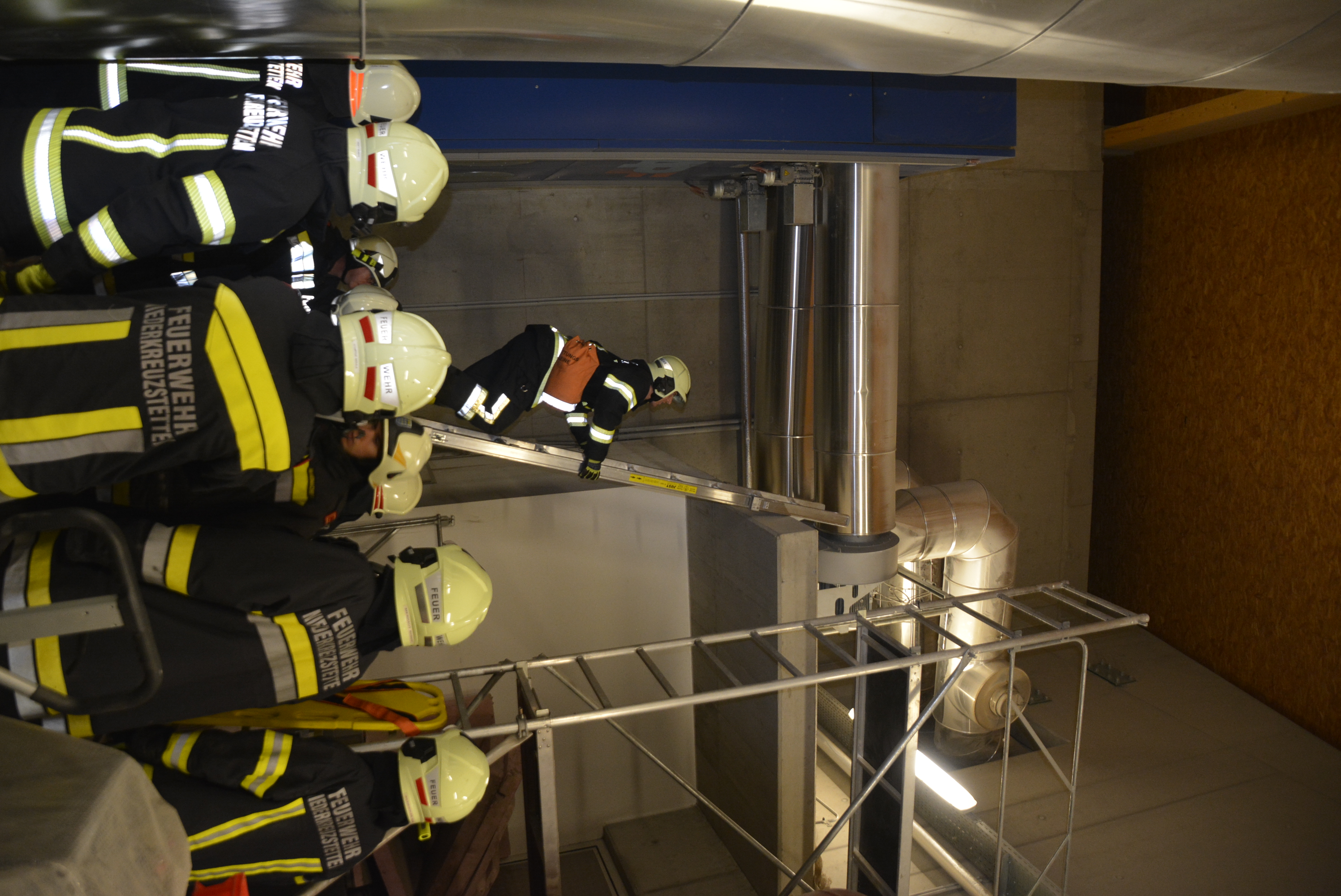 Mit präziser Teamarbeit und unter Einsatz von Spinboard, Rettungsleine und Steckleitern wurde die Rettung durchgeführt. Jeder Handgriff musste sitzen – Kommunikation, Sicherung und Technik waren entscheidend. Nach kurzer Zeit war der „Patient“ sicher am Boden, und die Übung konnte erfolgreich abgeschlossen werden.