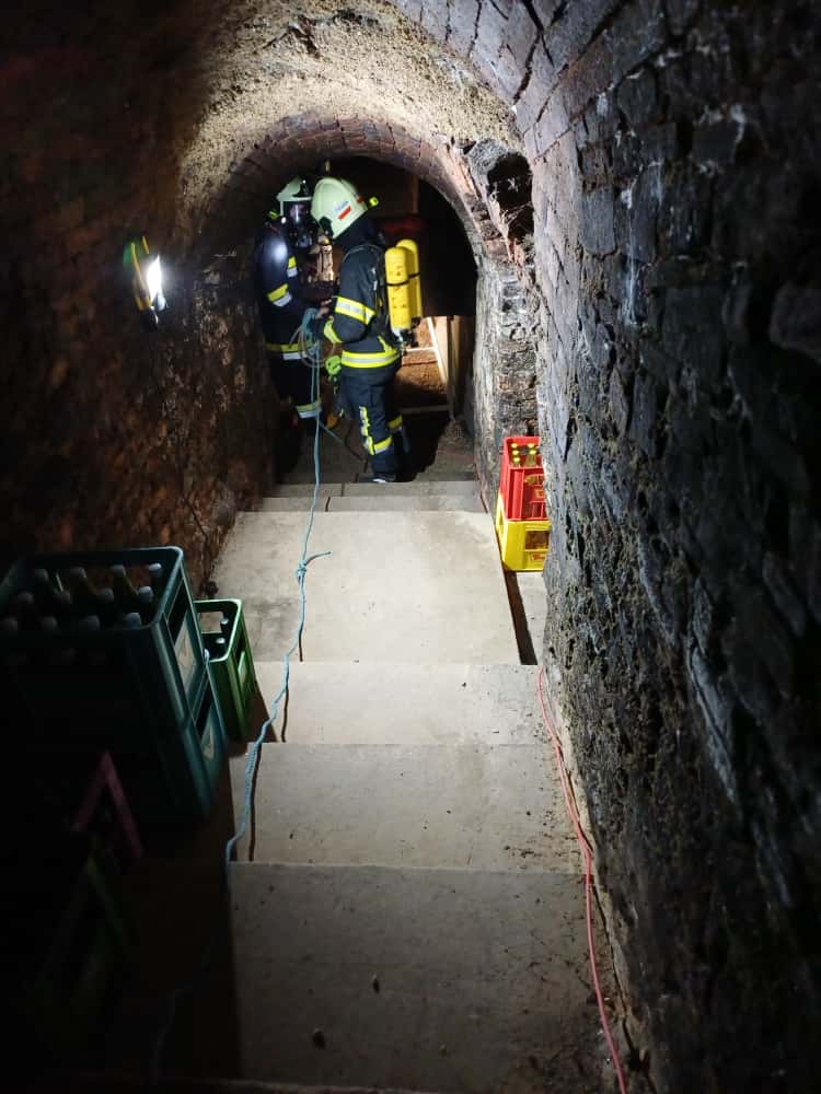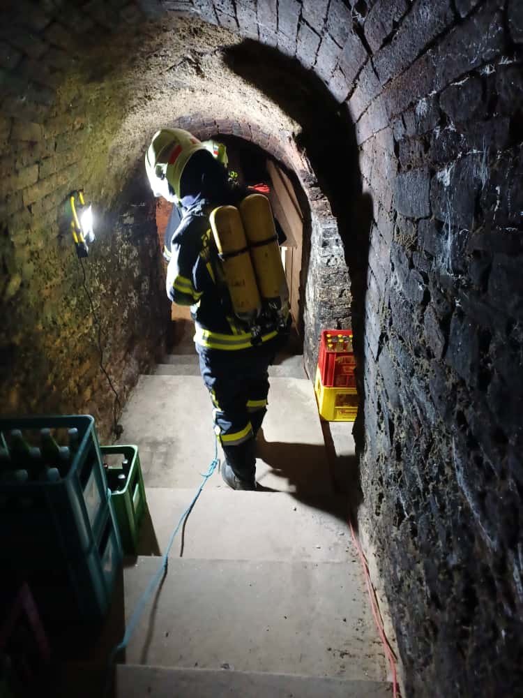 Nachdem der Trupp den mit Gärgas gefüllten Keller betreten hatte, zeigte sich, dass die Funkverbindung im Trunk Mode in der Kellerröhre nicht funktionierte. Kurzerhand wurde auf den Direct Mode umgestellt – und die Verbindung war wieder stabil. Nach Abschluss des Einsatzes verließ der Trupp den Keller und legte die Atemschutzausrüstung ab. Im Anschluss wurden die Messergebnisse des Mehrzweckmessgeräts sowie das Verhalten der Kerze genau besprochen und ausgewertet.